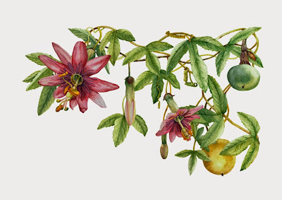 La ilustración muestra su hermosa flor rosada de gran tamaño, con estambres y pistilos notoriamente desarrollados, su fruto esférico, sus hojas de tres lóbulos y los zarcillos que le permiten anclarse y trepar sobre ramas de árboles creciendo hasta 15 metros.