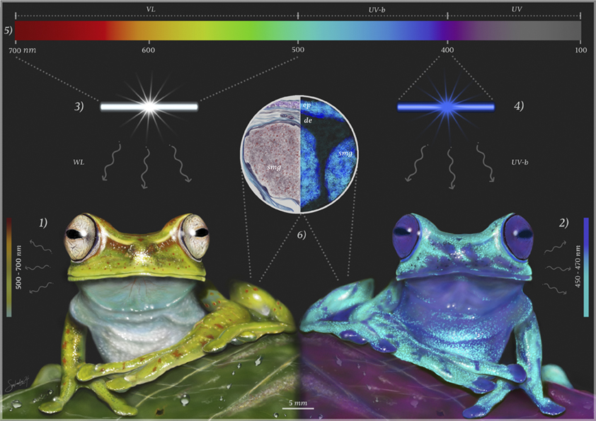 Descripción: Boana punctata es el primer anuro identificado con biofluorescencia, un fenómeno óptico donde la absorción de radiación electromagnética de longitud de onda corta es seguida por su reemisión en longitudes de onda más largas. Este fenómeno en la especie se atribuye a la emisión linfática y glandular de compuestos fluorescentes denominados Hyloin-G1, que absorben y reemiten luz inducidos por la irradiación UV-A/azul en los 400 nm (Taboada et al. 2017). Normalmente, los anuros reflejan longitudes de 500 a 700 nanómetros lo que les otorga el cromatismo dentro del espectro visible, sin embargo, con este descubrimiento se revela un fenómeno adicional que modifica la percepción visual de estos animales, aunque la función aun no es muy clara para la ciencia, se propone con base en estudios preliminares que optimiza la percepción visual y la comunicación en entornos terrestres. La Ilustración compara la apariencia de la especie bajo luz blanca y UV-azul.