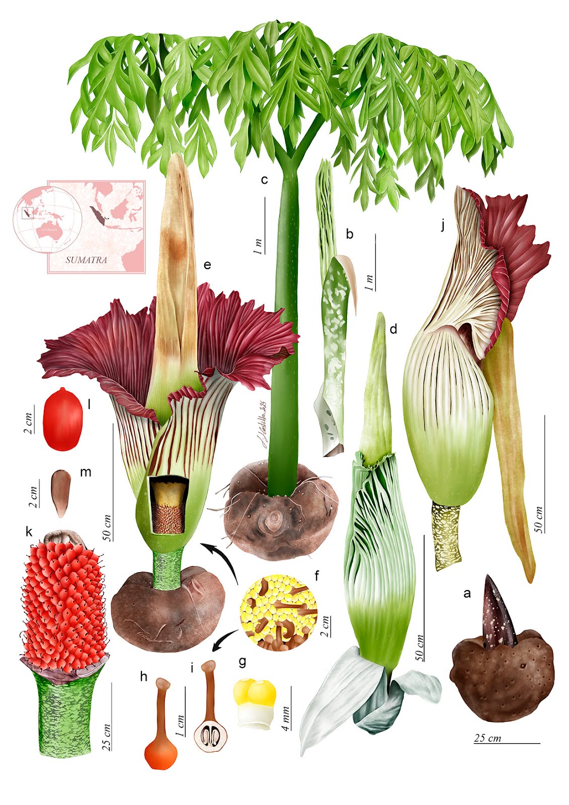 Descripción: Amorphophallus titanum (Araceae) , conocida como la "flor cadáver", es una planta originaria de Sumatra. Posee un tubérculo (a), del que brota una sola hoja (b-c), con porte arborescente, de hasta 5 m. Tras un periodo de inactividad surge la inflorescencia (d-e, j), formada por un espádice, protegido por una bráctea púrpura llamada espata. En la base del espádice (e, f), se encuentran las flores femeninas, y por encima, las masculinas. Durante la primera noche, tras la apertura de la espata, las flores femeninas (h-i) incrementan su temperatura hasta los 36ºC . Esto, unido al característico olor a carne en descomposición, atrae a los polinizadores: escarabajos carroñeros y moscas. Un día después se activan las flores masculinas (g), evitando la autopolinización. Este proceso da lugar a una infrutescencia (k) formada por un centenar de bayas rojas (l), cada una con dos semillas (m).