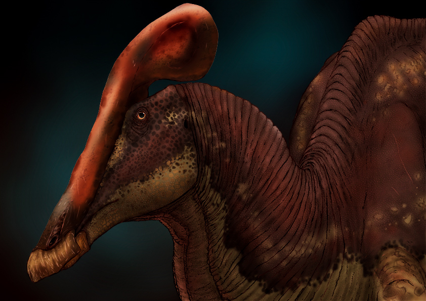 Descripción: Reconstrucción basada en la propuesta de los ligamentos de la nuca de Parasaurolophus Walkeri hecha por Filippo Bertozzo et al. En conjunto con la revisión de impresiones de piel en hadrosaurios lambeosaurinos realizada por Phil R. Bell y la reconstrucción de musculatura craneal y anatomía bucal de Ali Nabavizadeh. La coloración está inspirada en la serpiente del maíz. (Elaphe Guttata)
